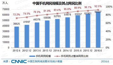 截至2016年12月,我國手機(jī)網(wǎng)民規(guī)模達(dá)6.95億,
